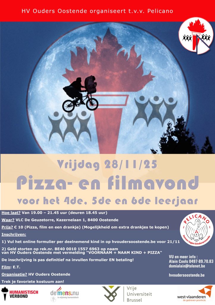 Het is weer zover! Onze jaarlijkse pizza- en filmavond gaat door op VRIJ 28/11/2025. We trekken de ruimte in met de film E.T.